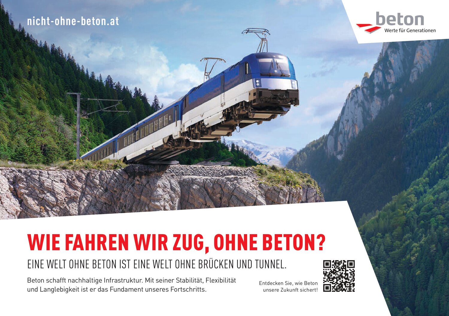Beton ist weltweit der meistverwendete Baustoff und in vielen Bauvorhaben unverzichtbar. Dies setzt nun Beton Dialog Österreich, die Interessensgemeinschaft der österreichischen Zement-, Transportbeton- und Betonfertigteilhersteller, in seiner neuen crossmedialen Kampagne unter dem Motto „Nicht ohne Beton“ erfolgreich in Szene. „Wie fahren wir Zug, ohne Beton?“ fragt das provokante Kampagnensujet, das einen Zug in der österreichischen Landschaft zeigt, der plötzlich vor einem Abgrund landet – blitzschnell baut sich eine Brücke auf und der Zug kann weiterfahren. „Eine Welt ohne Beton ist eine Welt ohne Brücken und Tunnel“ heißt die ernüchternde Antwort. „Wir wollen mit dieser mutigen Botschaft zum Nachdenken anregen und aufklären, dass der Ausbau der Infrastruktur in Österreich ohne Beton unmöglich ist. Nicht nur, wenn es um Bahnstrecken und Tunnel geht, sondern auch um Bahnschwellen, Lärmschutz und viele andere Lösungen – Beton ist ein wichtiger Bestandteil der Mobilitätswende“, erklärt Anton Glasmaier, Vorstandsvorsitzender von Beton Dialog Österreich.