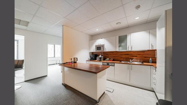 Zentraler Gemeinschaftsbereich: Ein offener, einladender Raum mit einer voll ausgestatteten Küche und einer Theke lädt zu gemeinsamen Kaffeepausen und informellem Austausch ein.