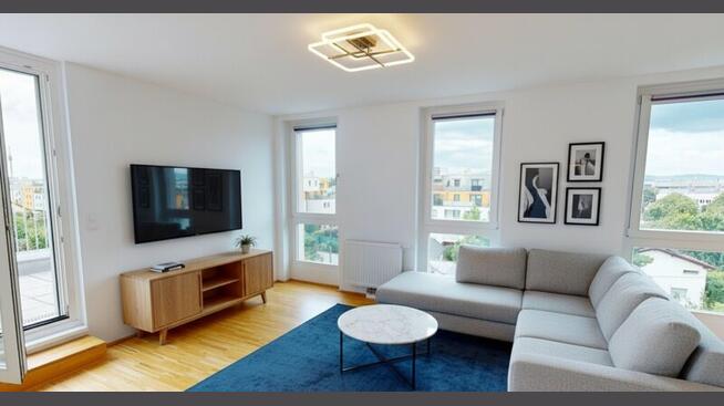 Von den Fenstern und von der Terrasse genießt man einen herrlichen Ausblick auf die Donaucity sowie bis hin zum Leopolds- und Kahlenberg.