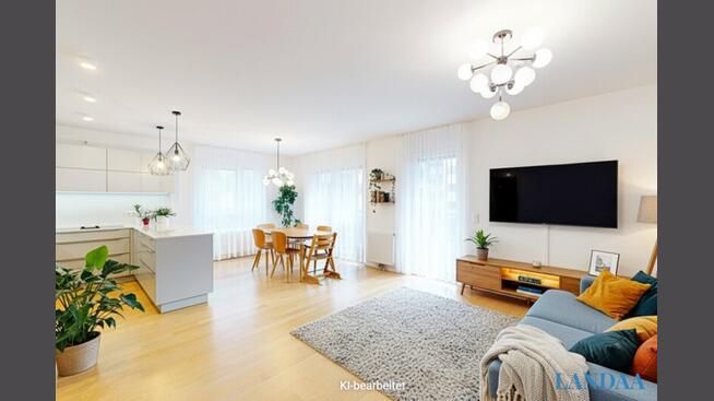 Der helle, weitläufige Wohn- und Essbereich mit moderner, offener Küche bildet das Herzstück der Wohnung. Von hier gelangen Sie auf den sonnigen Südost-Balkon (ca. 14,35 m²), der viel Platz für Entspannung im Freien bietet.