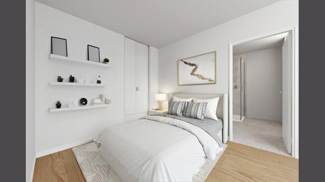 Vom Wohnbereich gelangt man in das Schlafzimmer mit angeschlossenem Badezimmer. Das Schlafzimmer bietet auf über 9 m² Platz für ein Bett, eine praktische Nische Stauraum für einen großen Schrank, auch von hier lässt sich der Dachgarten begehen.