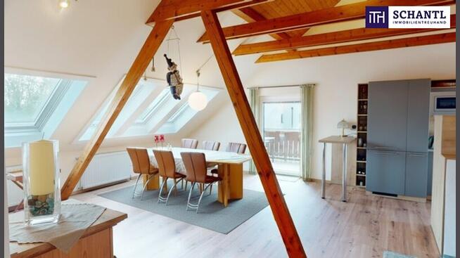 Ein echtes Highlight ist der Essplatz direkt unter dem großzügigen Dachfenster, das den gesamten Raum mit Tageslicht flutet und für eine einladende, freundliche Atmosphäre sorgt – ein Ort, an dem Wohnen, Genießen und Entspannen ineinander übergehen.