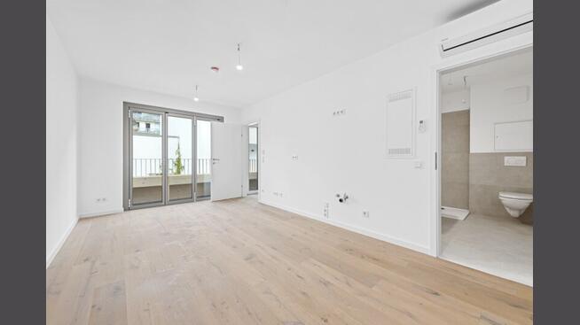 Nach dem Betreten der ca. 31 m² großen 2-Zimmer-Wohnung befindet man sich im offen gestalteten Vorraum, welcher idealen Platz für eine Garderobe, oder einen Schrank bietet. Die angeschlossene Wohnküche mit 16,60 m² bietet viel Licht dank bodentiefen faltbaren Fensterflächen. Hier lassen sich eine Couch und ein gemütlicher Essbereich wunderbar einrichten. Sämtliche Anschlüsse für die zukünftige Planung seiner individuellen Küchenzeile sind natürlich vorbereitet.