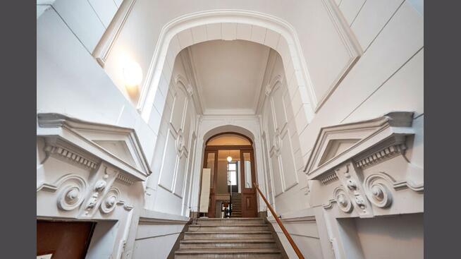 Diese charmante Wohnung im stilvollen Vordertrakt des Hauses und überzeugt nicht nur durch ihre großzügige Fläche von knapp 98 m², sondern vor allem auch durch die beeindruckende Raumhöhe von 3,6 m.