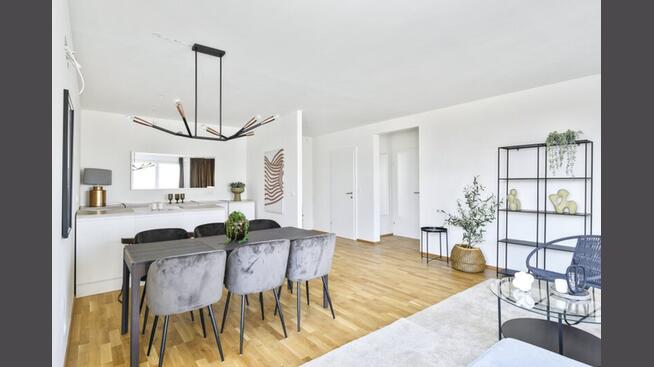 Das Herzstück der Wohnung bildet der Wohnbereich, welcher mit rund 41 m² großzügig dimensioniert ist und ausreichend Platz für schöne Möblierung nach individuellem Geschmack bietet. Eine zeitlose helle Küche mit großer Arbeitsfläche in Holzoptik ist bereits vorhanden und muss nicht mehr geplant werden.