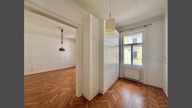 Das Herzstück der Wohnung bildet das großzügige Wohn- und Esszimmer mit Fischgrätparketten, das mit seinem klassischen Altbauflair zum Verweilen einlädt. Direkt angrenzend befindet sich das ruhige Schlafzimmer, das sowohl vom Wohnzimmer als auch vom Vorraum aus zugänglich ist – ideal für flexible Wohnkonzepte.