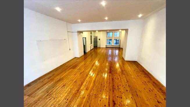 Großzügiges Raumkonzept: Das Herzstück bildet ein weitläufiger Open-Space-Bereich, der mit klassischem Parkettboden ausgestattet ist – ideal für Ateliers, Showrooms oder moderne Office-Konzepte.