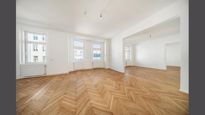 Der Wohnbereich gliedert sich in mehrere großzügige Zimmer entlang der Straßenfront, die durch ihre klassische Anordnung und gute Belichtung ein angenehmes Wohngefühl vermitteln. Diese Räume eignen sich ideal als Wohn-, Schlaf- oder Arbeitsbereiche und unterstreichen den loftartigen Charakter der Wohnung. Ein weiteres Zimmer ist hofseitig orientiert und bietet dadurch eine ruhigere Rückzugsmöglichkeit. Ergänzt wird das Raumangebot durch ein kleineres Zimmer, das sich optimal als Arbeitszimmer, Ankleide oder Gästezimmer nutzen lässt.